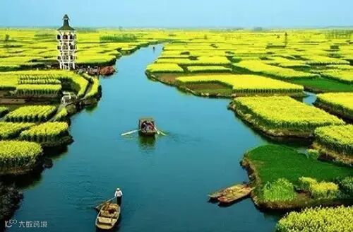 跟罗平、婺源的油菜花田不同,兴化的油菜花田虽然也有壮美的大片金黄,但却是开在水中,一块块垛田散布在广阔的湖面上,乘着小船泛舟水上,就像穿梭在金色的花海之中。