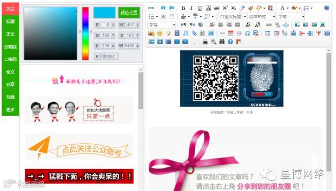 为了更好的微信文章展示效果,微页新增微信编辑器功能,做个小编非常的容易咯,选择样式,任意编排,
