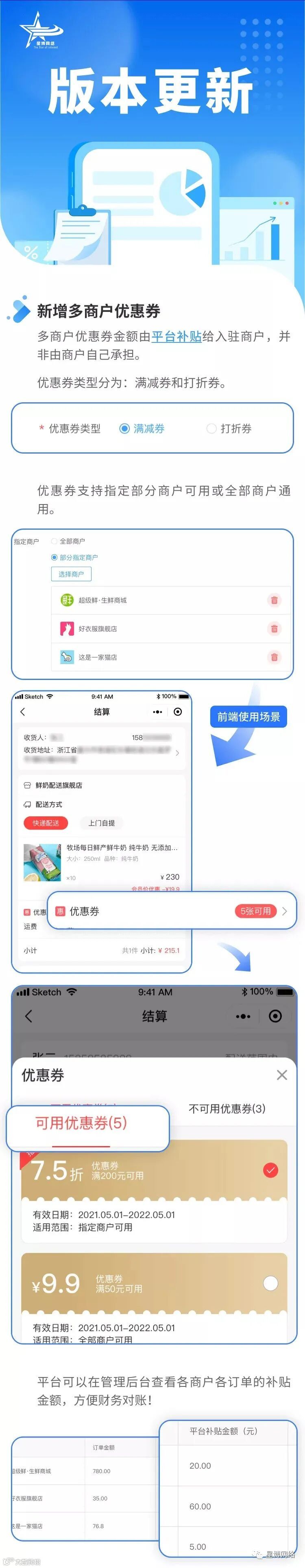 1、新增:平台可对入驻商户发放优惠券(平台补贴)功能;