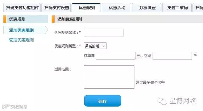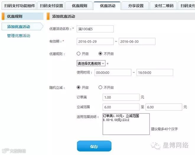 四、添加优惠活动,优惠活动主要是设置优惠活动的时间与这个时间段内的优惠规则(开启则有)和随机立减(开启则有)。