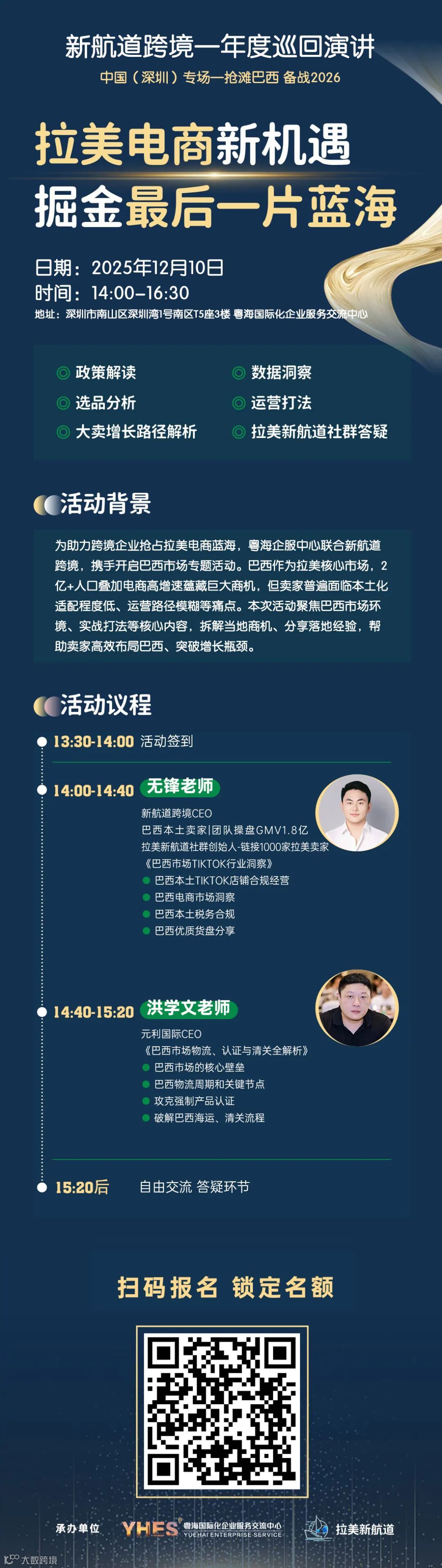 各位做跨境电商的伙伴们注意啦!想抓住 巴西电商爆发期 的,12 月 10 日 这场「新航道跨境年度巡讲(深圳专场)」必须冲!