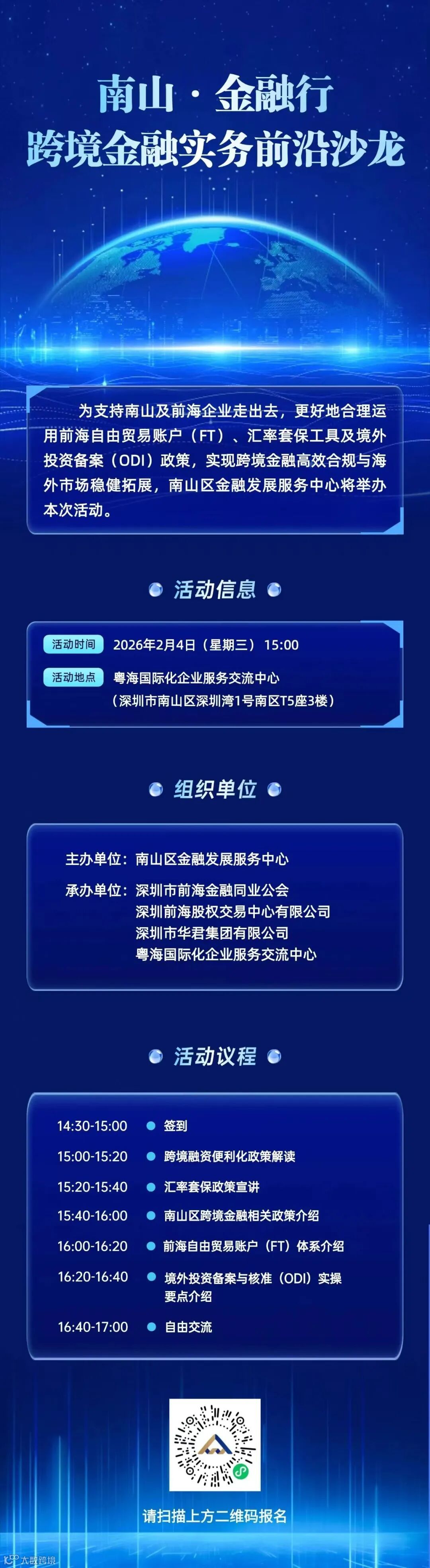 联合南山区金融发展服务中心等举办 “跨境金融实务前沿沙龙”,全面解读跨境融资、汇率套保、FT账户、ODI备案等热点政策与工具,助力企业合规出海、稳健发展。