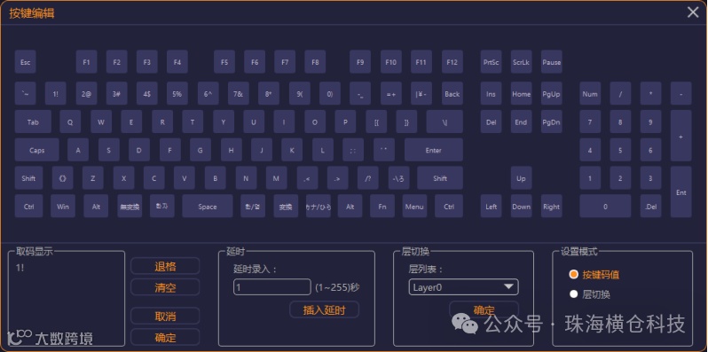a)在“设置模式”内选择“层切换键”,此时,按键界面将禁止输入。在“层列表”下拉菜单中选取切换的层名(Layer0- Layer7), 按取码框内的确认键。