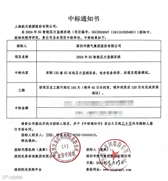 逐光向新,驰而不息。新的一年,航天能源紧跟国家数字化发展的步伐,坚持“聚焦主业、稳健经营、改革创新、夯实基础”的指导思想,充分利用资质、技术和品牌优势,成功中标深圳燃气2024年5G智能压力监测系统项目,这是继2023年中标同类项目之后再次中标,标志了公司在智能气网领域技术能力得到用户高度认可和肯定。