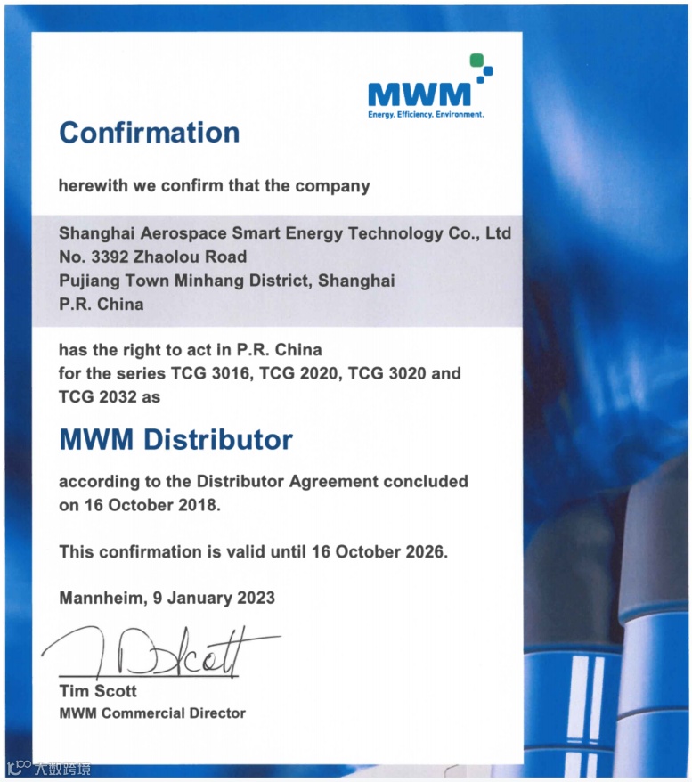 2023年2月9日,上海航天智能与MWM代理商授权协议续签仪式在上海隆重举行。MWM亚太区销售总经理、中国区董事总经理章勇军,MWM中国区销售高级经理崔锐,航天能源总经理张铁军,航天智能总经理郭甲生、营销业务部部长王斐等出席了本次签约仪式。
