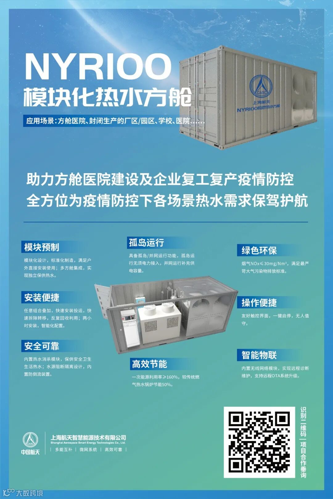 为助力方舱医院建设及企业复工复产疫情防控工作,上海航天智能迅速组建以青年干部为主的模块化热水方舱项目组,项目组在前期NY40+热水模块丰富的场景应用经验基础上,云上协同设计,快速响应,依托领先的研发实力,过硬的航天品质,强大的服务保障能力重磅推出【NYR100 模块化热水方舱】, 解决方舱医院、封闭生产的工厂/园区、学校等应用场景热水需求,模块预制、快速响应、安装便捷、一键启停、安全可靠,全方位为疫情防控下各场景热水需求保驾护航。