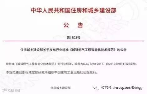 3月23日,住房城乡建设部发布了燃气行业标准《城镇燃气工程智能化技术规范》CJJ/T268-2017,该规范将于2017年9月1日起正式实施。