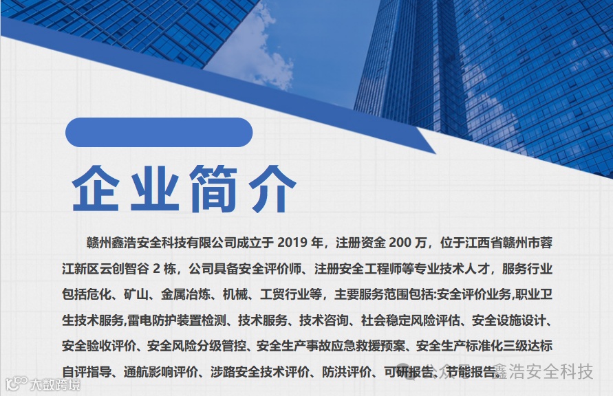 公司现安全评价业务,职业卫生技术服务,雷电防护装置检测、技术服务、技术咨询、社会稳定风险评估、安全设施设计、安全验收评价、安全风险分级管控、安全生产事故应急救援预案、安全生产标准化三级达标自评指导、通航影响评价、涉路安全技术评价、防洪评价