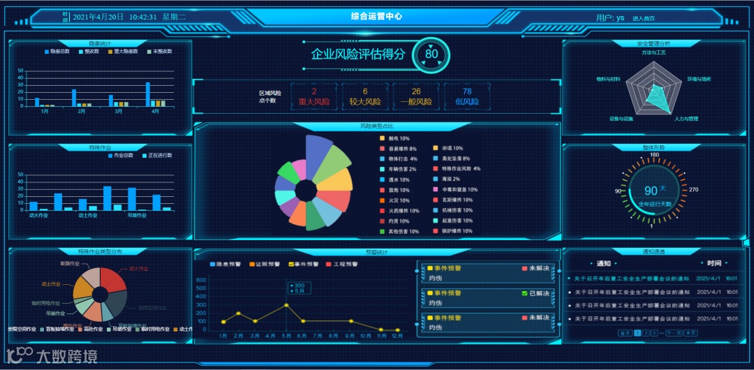 实现对企业风险点、隐患情况、作业分布等数据进行统计分析,直观呈现企业的实时安全状态和监测预警情况,全面掌握企业安全态势。