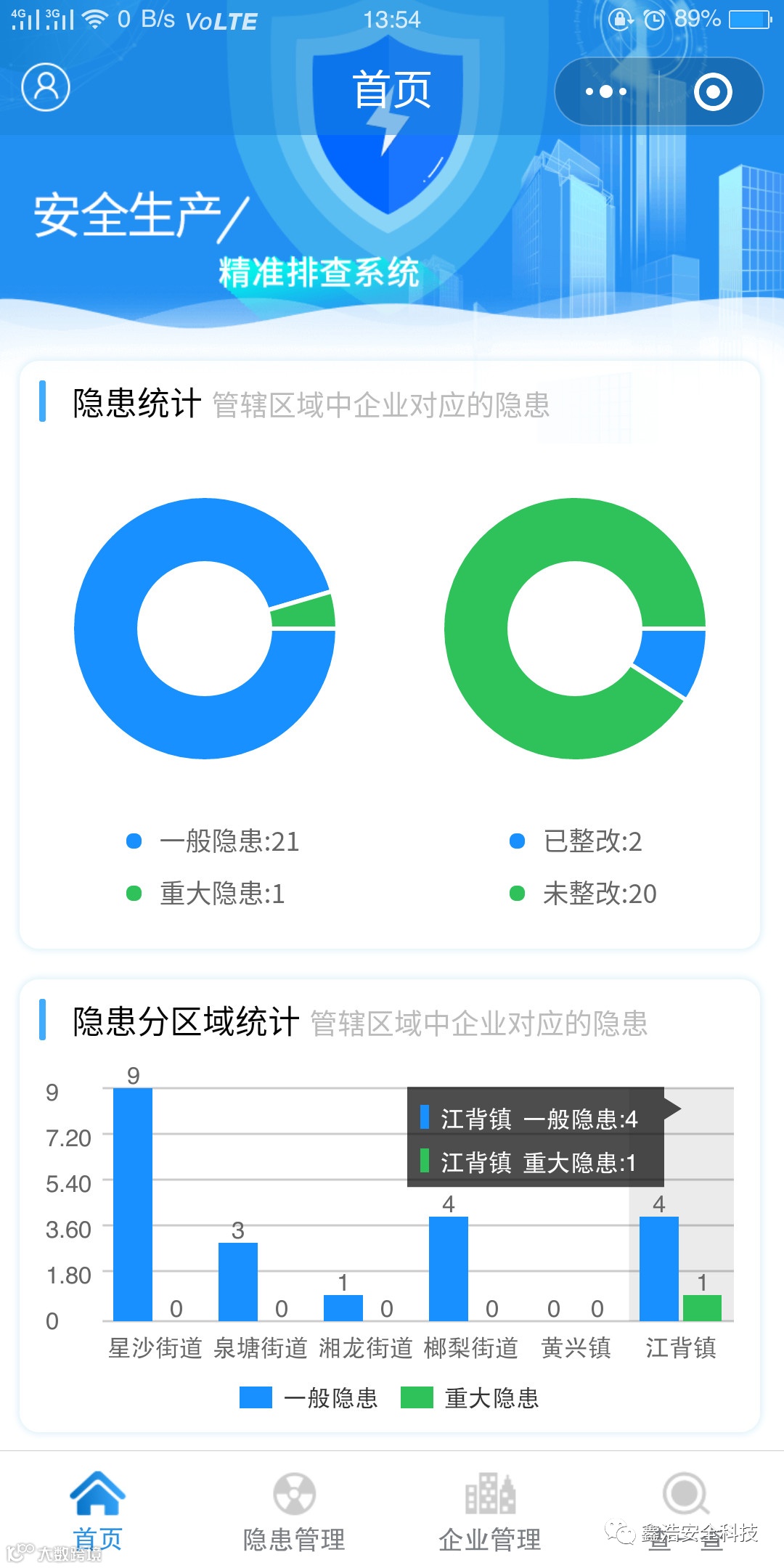 平台着眼于当前第三方机构隐患排查工作耗时、耗力、排查不彻底的问题,利用轻便的信息化载体(微信小程序),通过信息化、智能化手段,简化操作流程,开展精确、全面、专业、快速的安全隐患排查并实现辖区信息共享。