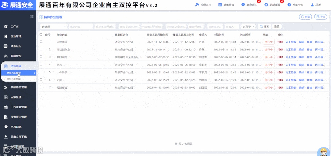 根据八大作业类型,可实现特殊作业线上管理,直观呈现相应的安全作业证、编制人安全交底人、接受交底人、监护人等情况,完工验收后自动生成特殊作业档案,支持一键导出功能,便于调取查询。