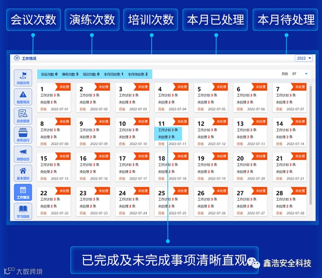 平台动态匹配工作计划,协同工作提醒功能,实时引导企业安全管理人员进行自主管理,直观了解各项工作实施进度,已完成事项、待完成事项等,及时查漏补缺,日常管理工作日趋流程化、标准化、规范化。