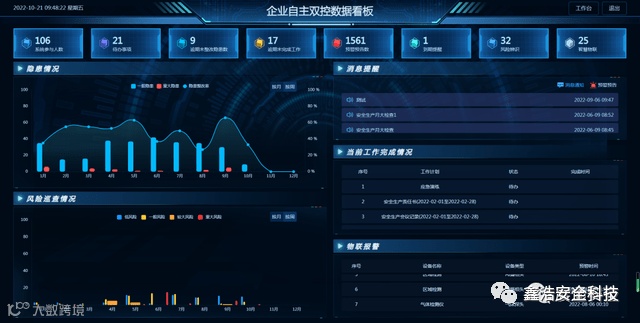 构建可视化数据中心看板,集成汇总企业安全生产运行数据,涵盖隐患情况、风险巡查情况、工作完成情况、预警预告情况、到期提醒、物联报警等,便于负责人全盘掌握企业安全管理动态。