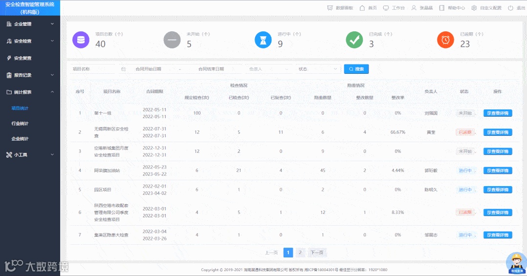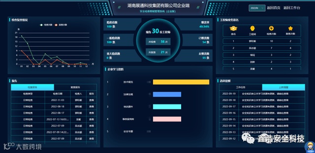 充分整合各类业务数据,如安全隐患情况、检查复查情况、检查复查报告、企业学习资料、工程师业务排名、工作任务等一目了然,为有的放矢地开展安全工作提供数据支撑。