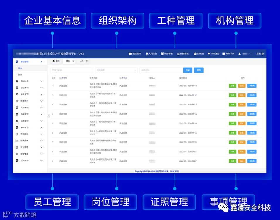 通过业务流程引导、工作任务实时提醒、预警提醒、便捷化索引等功能,助力安全人高效便捷的完成日常安全管理工作。