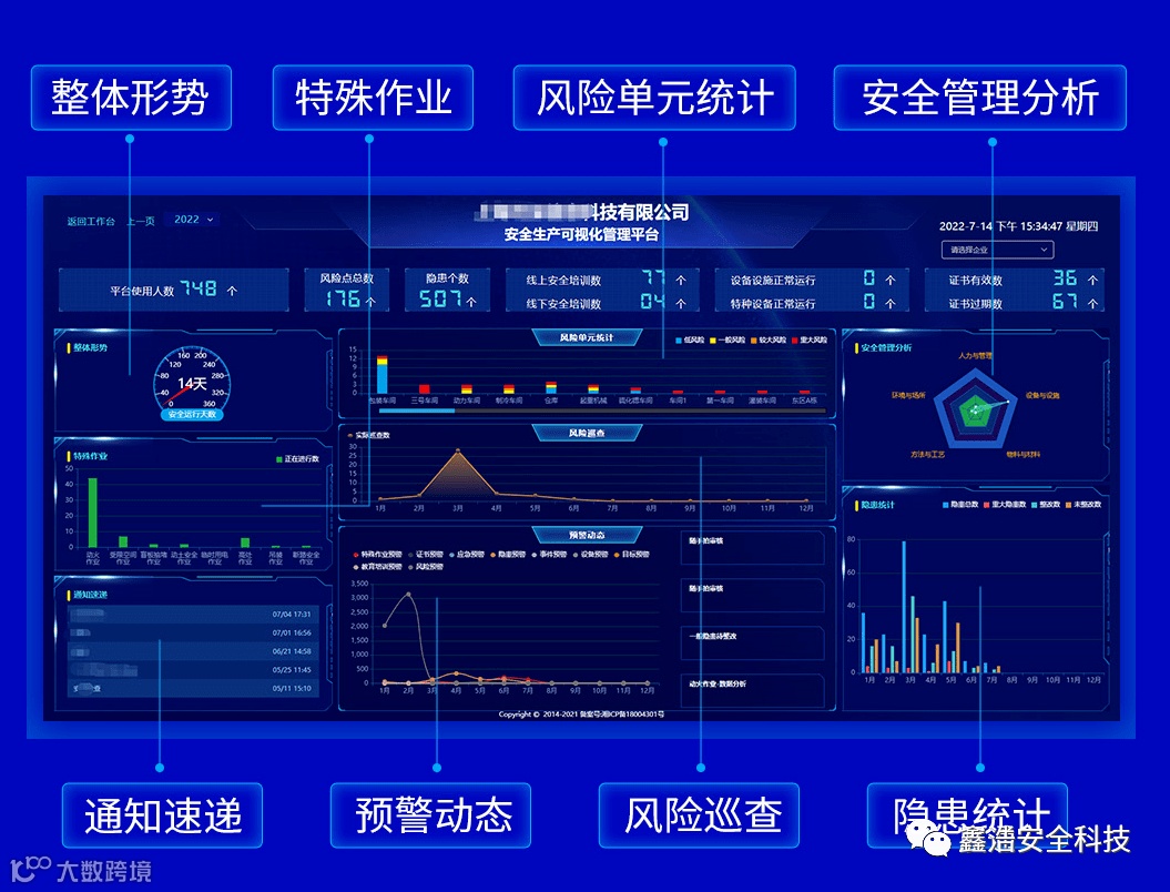 ❖ 平台充分整合各类安全数据,构建安全生产可视化数据中心,公司安全态势及工作进度一目了然,便于负责人全盘掌握整体安全生产动态。