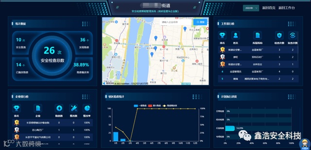 实现政府与企业检查数据互通,并集成汇总各类业务数据,如企业检查和复查情况、隐患整改率、辖区隐患统计、安全检查工作排名榜、检查计划实施进度等,辖区安全隐患底数清晰。