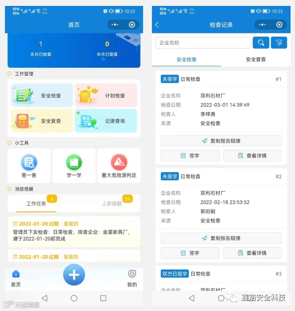 系统配备了小程序端,并与电脑端数据实时互联共享,方便检查人员开展日常安全检查工作;随即生成安全检查/复查报告,增加工作的灵活性及便利性。