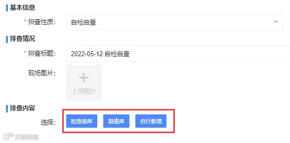 支持“检查表库、隐患库、自行新增”