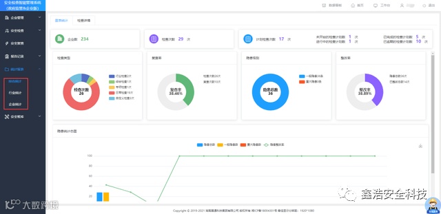 实现行业、企业等多维度安全检查情况数据统计与分析,智能输出报表,为监管部门科学施策提供精准的数据支撑。