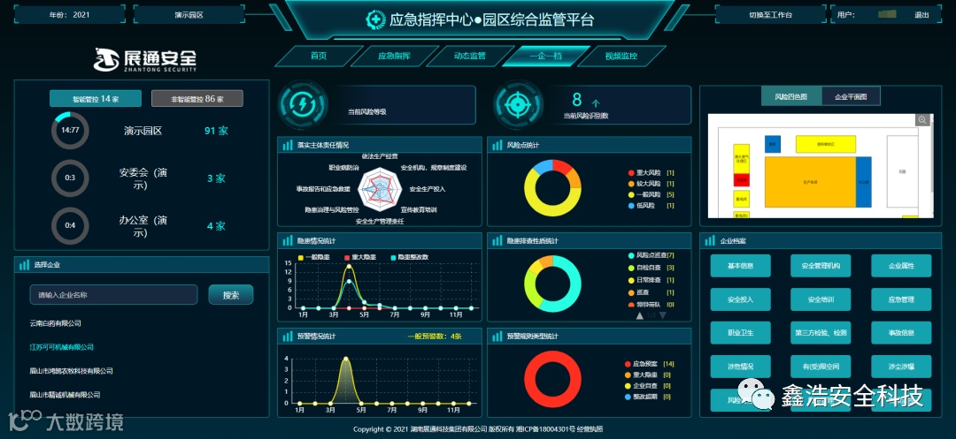 平台集应急指挥、动态监管、一企一档、视频监管、预警管理等多项功能于一体。通过信息化平台运作,全盘掌控园区安全态势,强化风险防控与隐患排查治理,建立责任明确、联动有序的管理机制,全面提升园区安全监管效能。