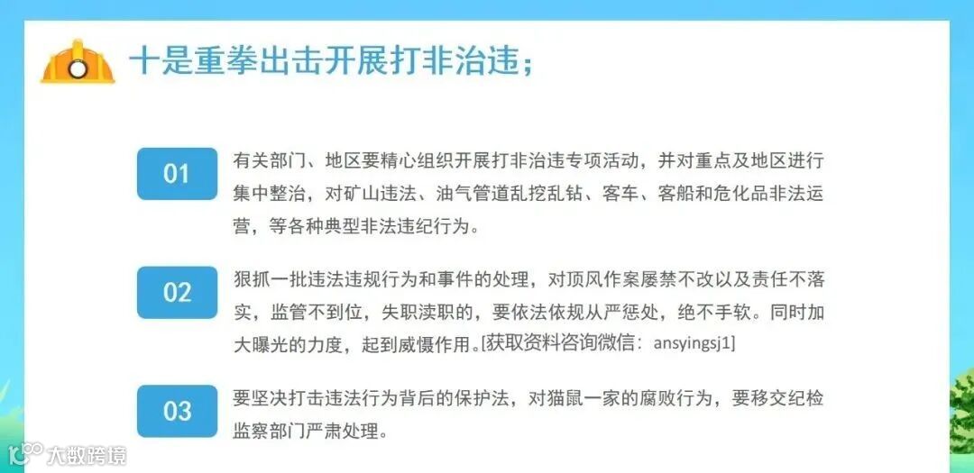 (十)"打非治违"工作开展情况。各地区、各有关部门是否组织开展"打非治违"专项活动,是否采取精准措施严厉打击矿山违法盗采、油气管道乱挖乱钻、客车客船渔船和危化品非法运营等各种典型非法违法行为。是否依法依规从重惩处顶风作案、屡禁不改以及监管不到位等问题,是否加大曝光警示力度,是否坚决打击违法行为背后的"保护伞"、加大"猫鼠一家"腐败行为查处力度等。