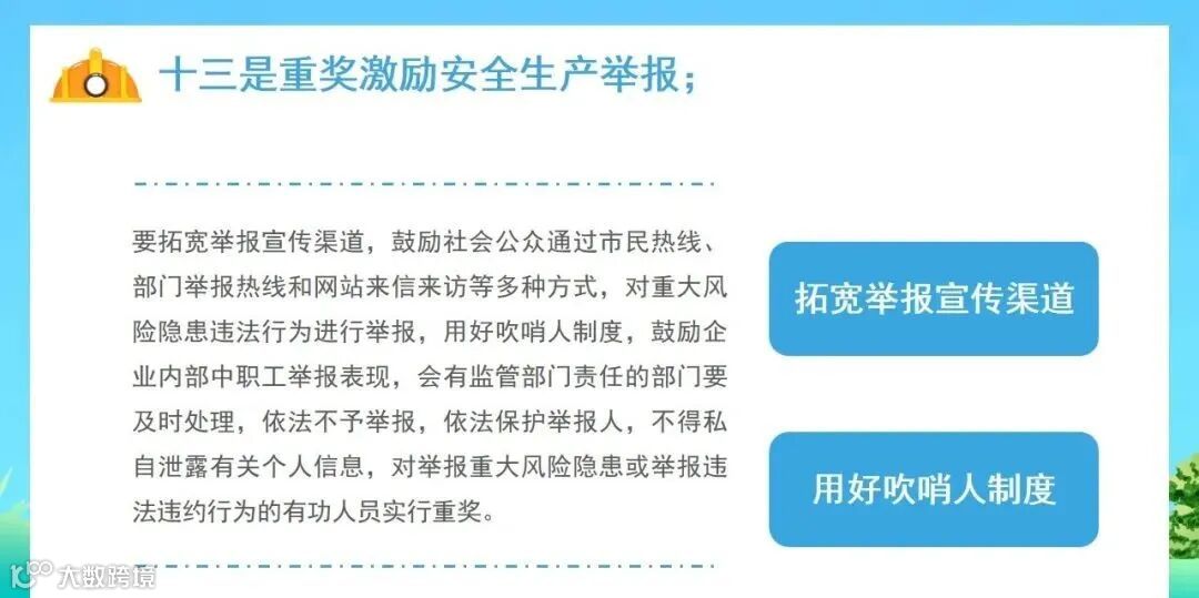 (十三)安全生产隐患举报奖励情况。是否拓宽举报奖励宣传渠道,是否建立完善安全生产"吹哨人"制度。负有安全生产监督管理职责的部门是否及时处理举报,是否依法保护举报人并落实举报奖励制度等。