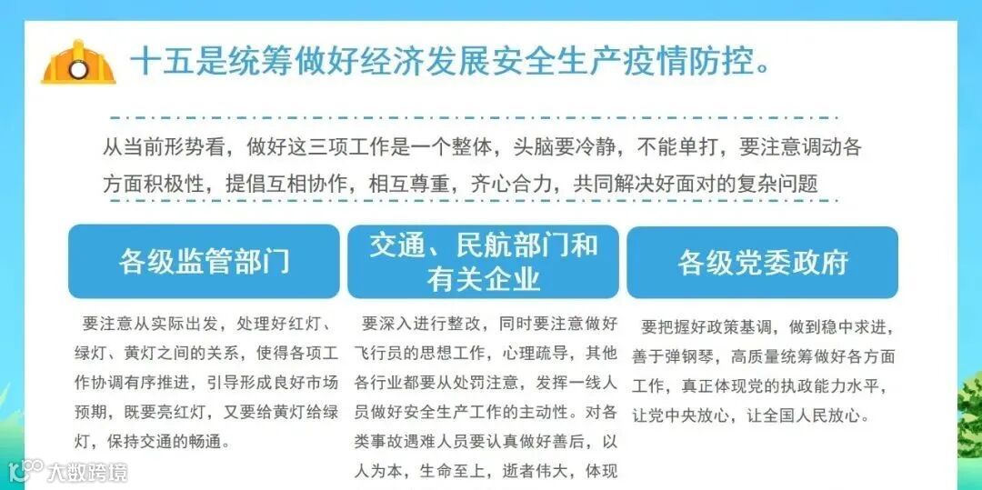 (十五)统筹做好经济发展、疫情防控和安全生产工作情况。地方各级党委政府、各有关部门是否根据当前形势统筹做好经济发展、疫情防控和安全生产工作,是否处理好安全监管和指导服务的关系,是否及时对特困行业纾困解难保障安全管理。是否发挥一线人员做好安全生产工作的主动性。是否做好各类事故遇难人员的善后处置工作等。