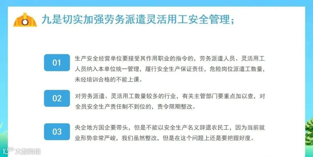 (九)劳务派遣和灵活用工人员安全管理情况。生产经营单位是否将接受其作业指令的劳务派遣人员、灵活用工人员纳入本单位统一管理,危险岗位是否严控劳务派遣员工数量,有关部门是否对相关情况较突出的行业领域部署开展重点执法检查。央企国企在有关人员管理上是否发挥示范带头作用等。