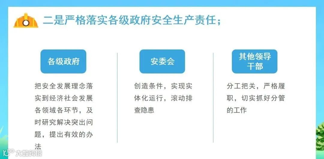 (二)地方政府安全生产责任落实情况。各级政府是否把安全发展理念落实到经济社会发展各领域、各环节,主要负责人是否根据地方党委会议的要求及时研究解决安全生产突出问题并主动协调跨地区、跨区域安全生产工作,其他领导干部是否切实抓好分管行业领域安全生产工作、安委办运行情况等。