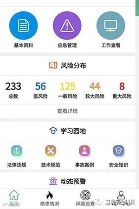 企业自主双控平台(俗称企业端)集风险分布、隐患情况、体系运行、应急管理、预警动态、基本信息、工作情况、学习园地、物联网管理等功能于一体,