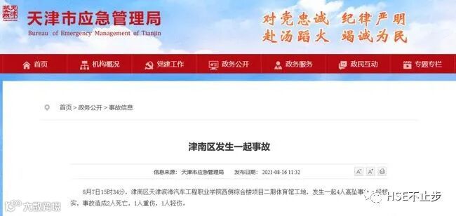 8月7日15时34分,天津市津南区天津滨海汽车工程职业学院西侧综合楼项目二期体育馆工地,发生一起4人高坠事故,造成2人死亡,1人重伤,1人轻伤。