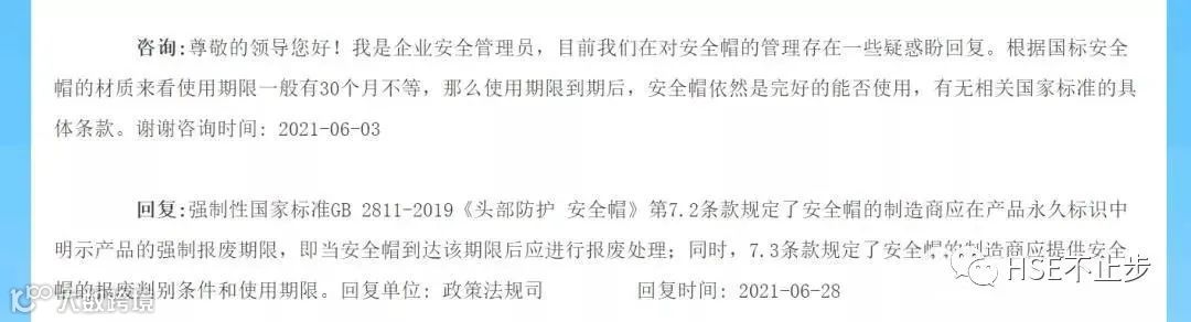 咨询:尊敬的领导您好!我是企业安全管理员,目前我们在对安全帽的管理存在一些疑惑盼回复。根据国标安全帽的材质来看使用期限一般有30个月不等,那么使用期限到期后,安全帽依然是完好的能否使用,有无相关国家标准的具体条款。谢谢咨询时间: 2021-06-03