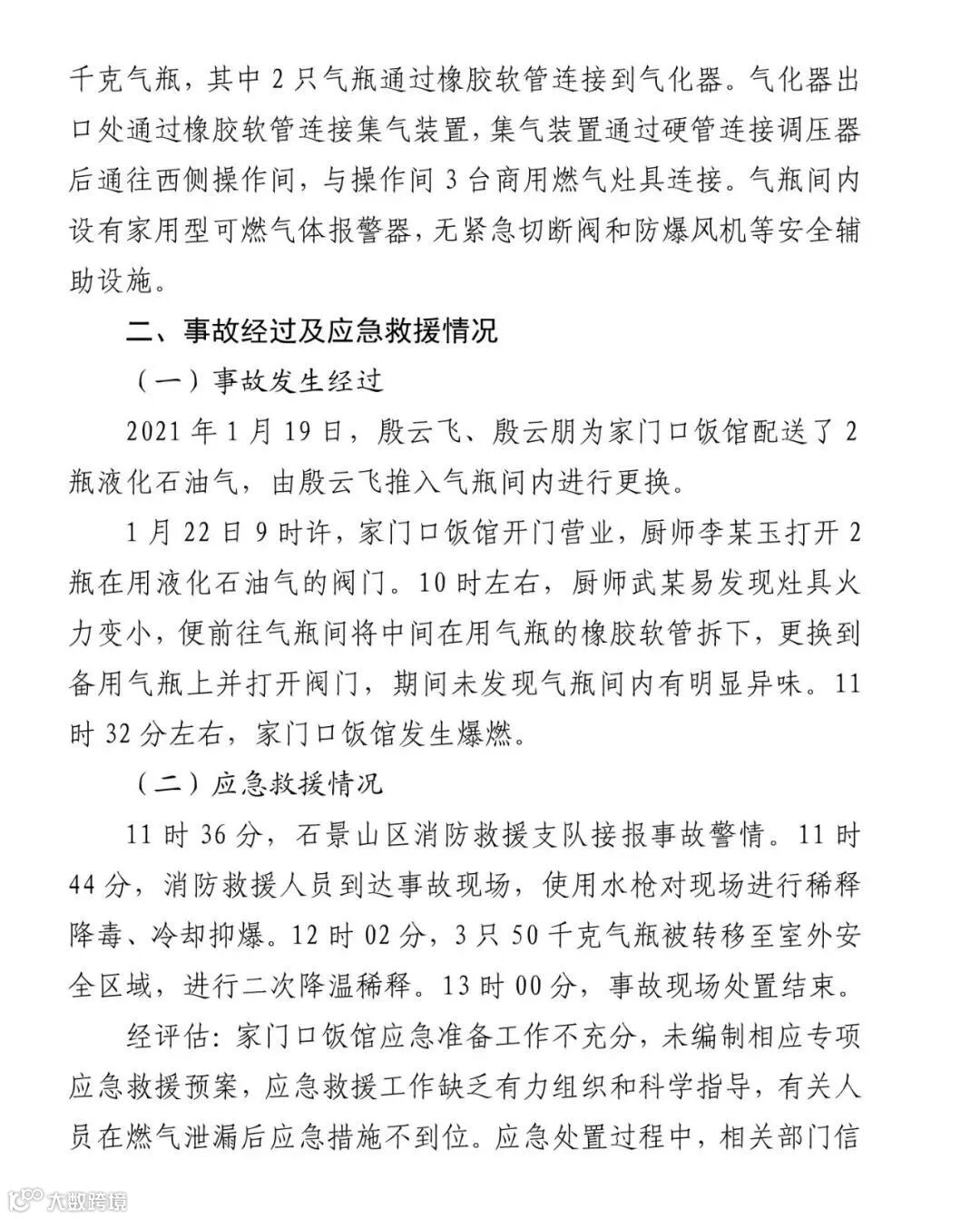 北京应急管理局通报:2021年1月22日11时32分左右,位于石景山区八角街道 的北京市家门口饭馆(以下简称家门口饭馆)发生液化石油气爆燃事故,造成10人受伤(2人轻伤、8人轻微伤),直接经济损失26.3万元。