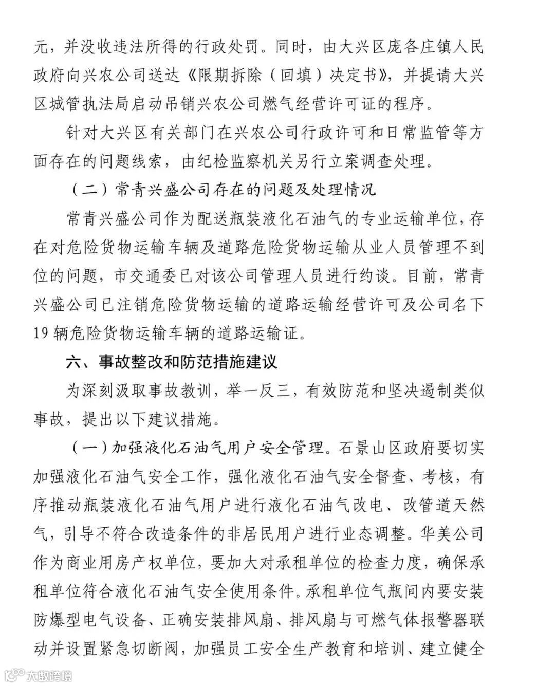 1.殷云飞,常青兴盛公司危险品运输驾驶员,向家门口饭馆 销售瓶装液化石油气,对事故发生负有责任。自 2016 年 4 月至 2021 年 1 月,殷云飞在未取得燃气经营许可的情况下,非法从 事燃气经营活动,与殷云朋非法经营额共计 28 万余元,涉嫌非 法经营罪。2021 年 3 月 19 日,由石景山区人民检察院批准逮捕。