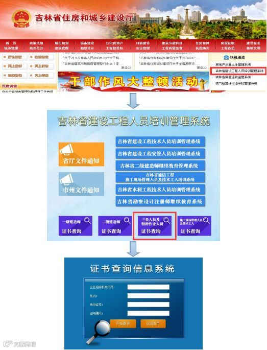 吉林省住房和城乡建设厅官方网站 http://jst.jl.gov.cn,“快速通道”中点击“吉林省建设工程人员培训管理系统”→“三类人员及特种作业人员证书查询”进行查询;或者直接登录: