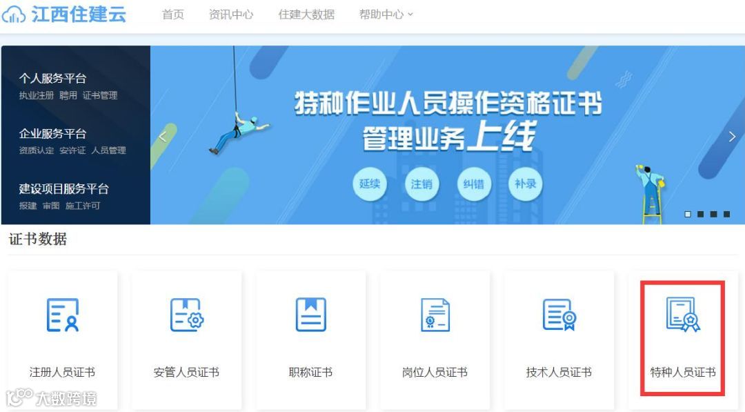 江西省住房和城乡建设厅官方网站http://zjt.jiangxi.gov.cn,依次点击“江西省住建云平台” →“特种人员证书”进行查询;或者直接登录http://zjy.jxjst.gov.cn/w/dataQuery/specialList 进行查询。