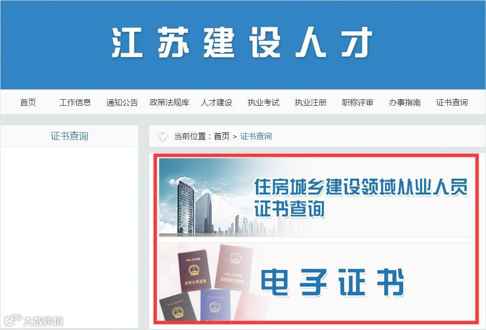江苏省住房和城乡建设厅官方网站http://jscin.jiangsu.gov.cn,依次点击“建设人才”→“住房和城乡建设领域从业人员证书查询”或“电子证书”进行查询;或者直接登录: