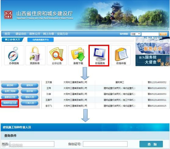 山西省住房和城乡建设厅官方网站 http://zjt.shanxi.gov.cn,依次点击“ 在线查询”→“ 特种作业人员” 进行查询;或者直接登录http://zjt.shanxi.gov.cn/onlineoffice/onlinesearch.action 进行查询。