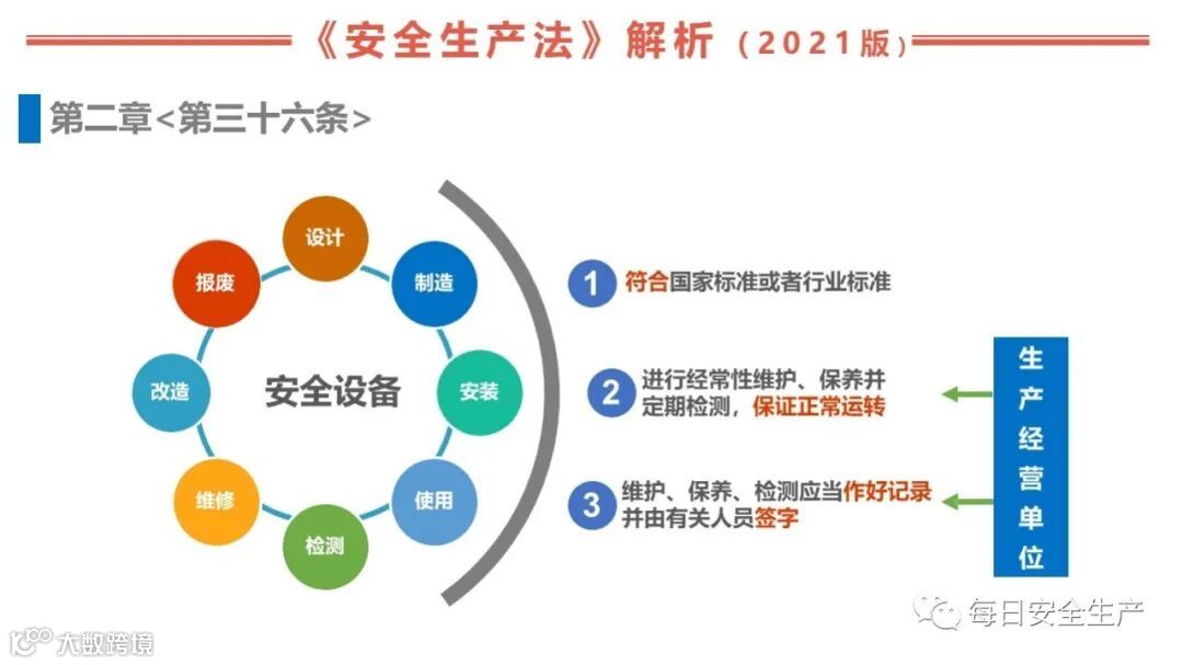 第三十六条 安全设备的设计、制造、安装、使用、检测、维修、改造和报废,应当符合国家标准或者行业标准。