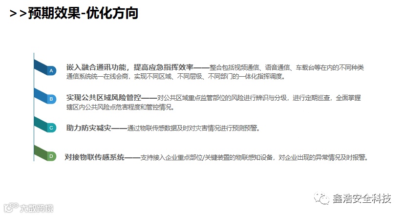 2021年1月25日上午会议中要求各县(市、区)局到2021年底前,基本形成较为完备的现代化“智慧应急”体系,基本建成覆盖生产安全、自然灾害、城市安全等重点风险领域的感知网络、多手段融合的应急通信网络,应急管理业务应用体系全面覆盖各类业务并在突发事件的事前、事发、事中、事后阶段发挥关键支撑作用,技术创新实力逐步提升,“互联网+”、移动应用等得到全面普及,监测预警、监管执法、救援实战、辅助决策和社会动员等方面基本实现智能化,形成全面感知、动态监测、智能预警、扁平指挥、快速处置、精准监管、人性服务的“智慧应急”新模式。