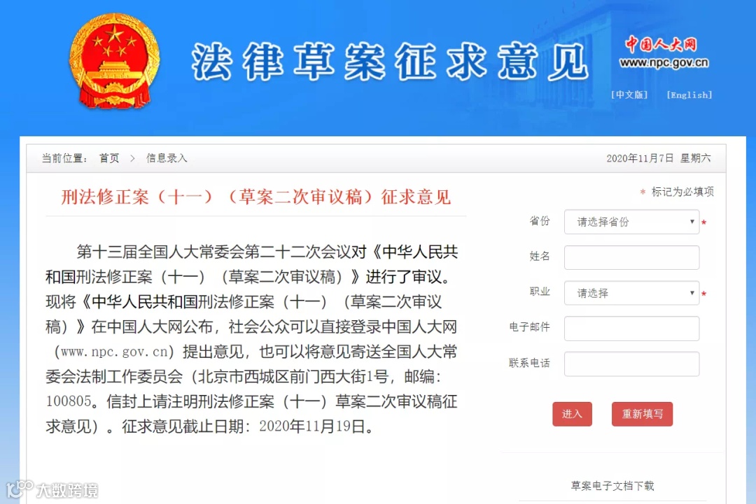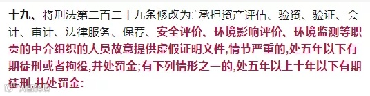 近日,我国刑法修正案(十一)(草案二次审议稿)征求意见稿,正式面向社会进行意见征求,其中,将刑法第二百二十九条修改为:承担资产评估、验资、验证、会计、审计、法律服务、保荐、安全评价、环境影响评价、环境监测等职责的中介组织的人员故意提供虚假证明文件,情节严重的,处五年以下有期徒刑或者拘役,并处罚金;涉及公共安全的重大工程、项目中提供虚假的安全评价、环境影响评价证明文件,致使公共财产、国家和人民利益遭受特别重大损失的,处五年以上十年以下有期徒刑,并处罚金。