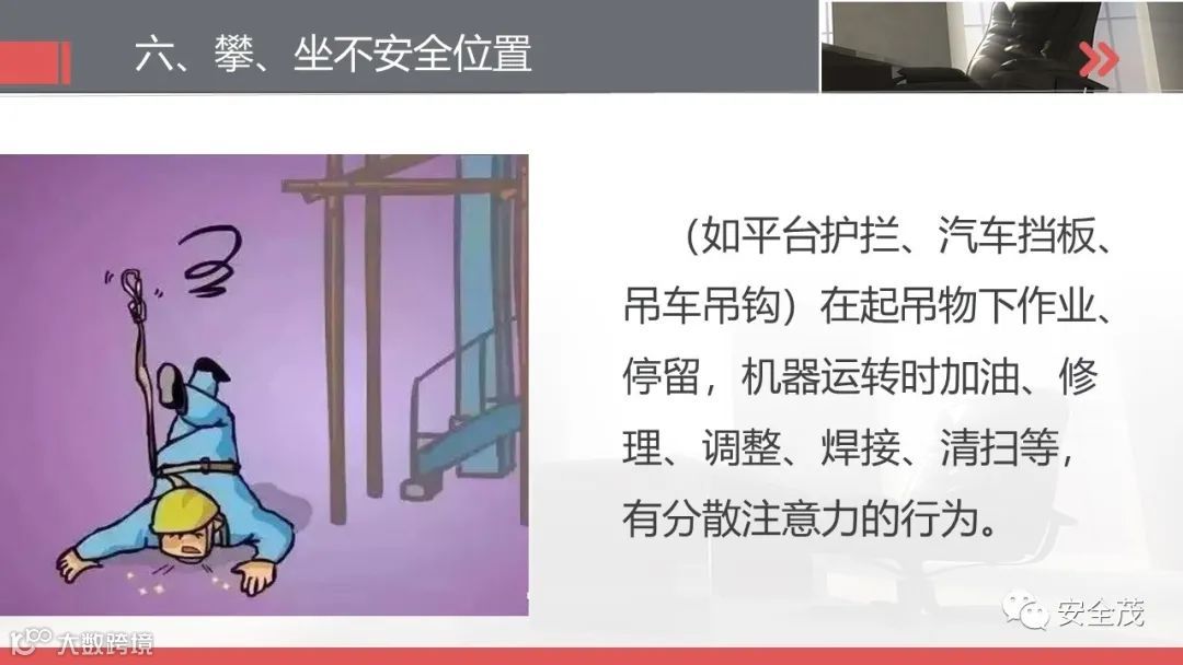 在起吊物下作业、停留,机器运转时加油、修理、调整、焊接、清扫等,有分散注意力的行为。
