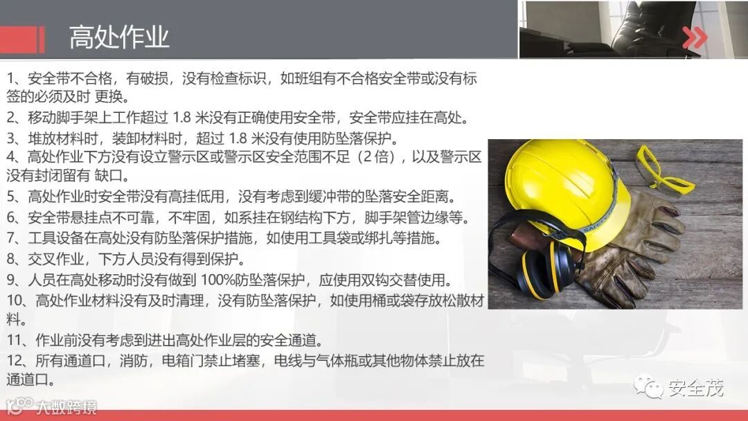 9、人员在高处移动时没有做到100%防坠落保护,应使用双钩交替使用。