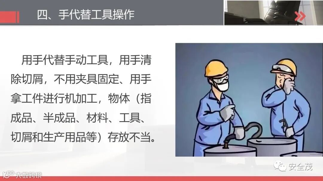 用手代替手动工具,用手清除切屑,不用夹具固定、用手拿工件进行机加工,物体(指成品、半成品、材料、工具、切屑和生产用品等)存放不当。