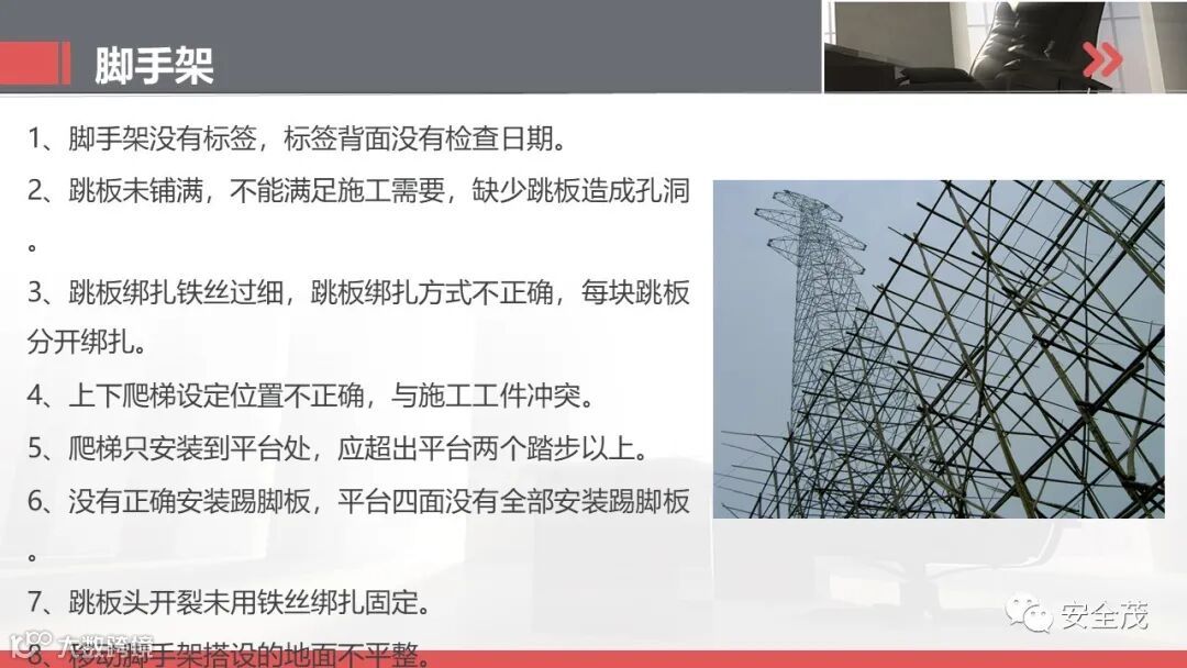 2、移动脚手架上工作超过1.8米没有正确使用安全带,安全带应挂在高处。