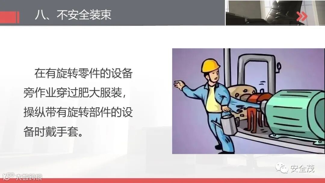 在有旋转零件的设备旁作业穿过肥大服装,操纵带有旋转部件的设备时戴手套等。