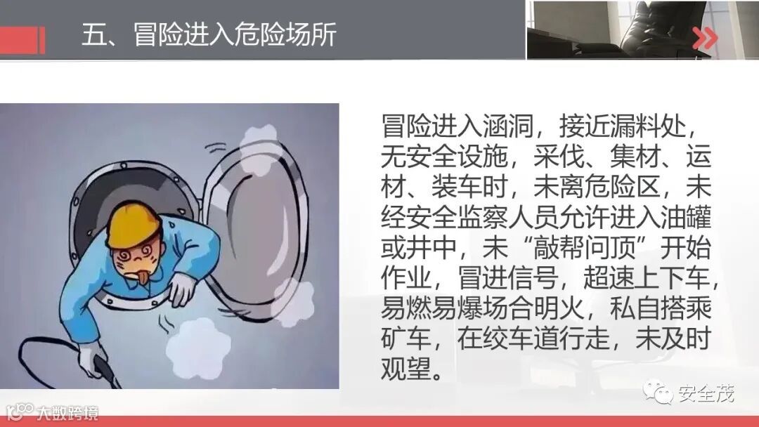 复工后,冒险进入有限空间,接近漏料处无安全防护设施,采伐、集材、运材、装车时未远离危险区,未经安全监察人员允许进入油灌或井中,未“敲帮问顶”盲目作业,易燃易爆场合使用明火等。