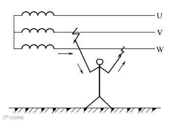 两相触电是指人体同时接触设备或线路中的两相导体而发生的触电现象。若人体触及一相火线、一相零线,人体承受的电压为220V;若人体触及两根火线,则人体承受的电压为线电压380V。两相触电对人体的危害更大。