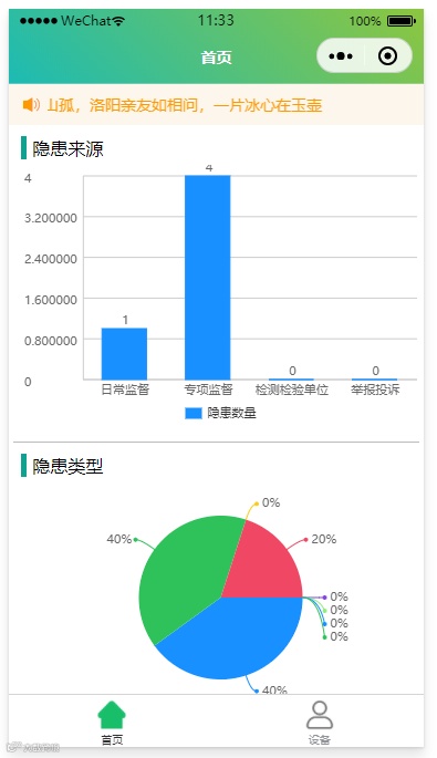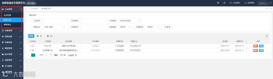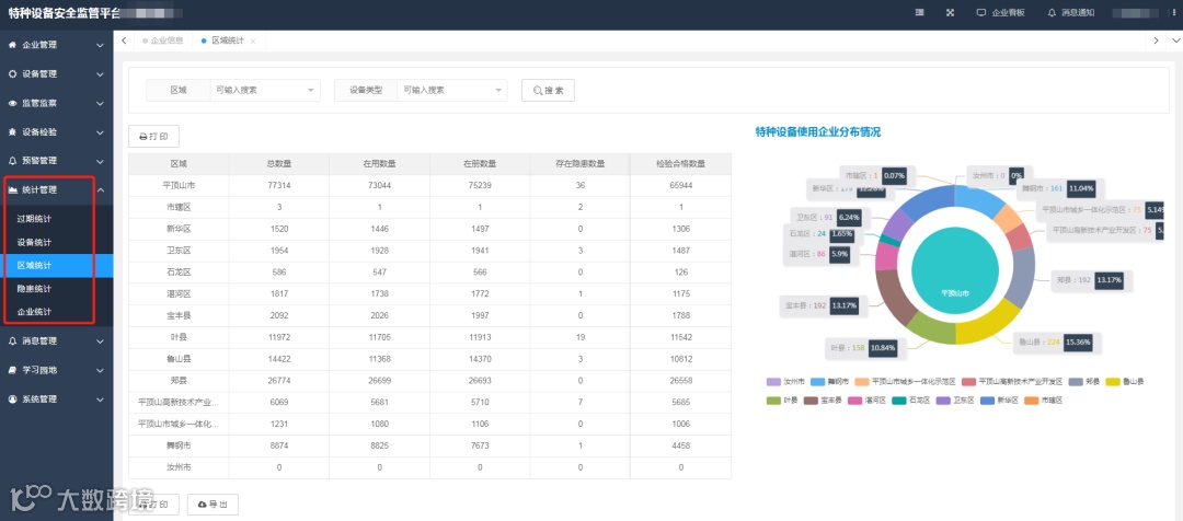 平台有效整合现有特种设备海量监管数据资源,实现全量数据融合、实时数据零延迟显示。平台以“五图一表”形式统计辖区企业、特种设备、人员及隐患等多项指标情况,全方位展示辖区内特种设备安全运行态势。多维度可视分析图表,一目了然,快速直观,底数清晰,为监管部门安全科学高效决策提供数据支持。